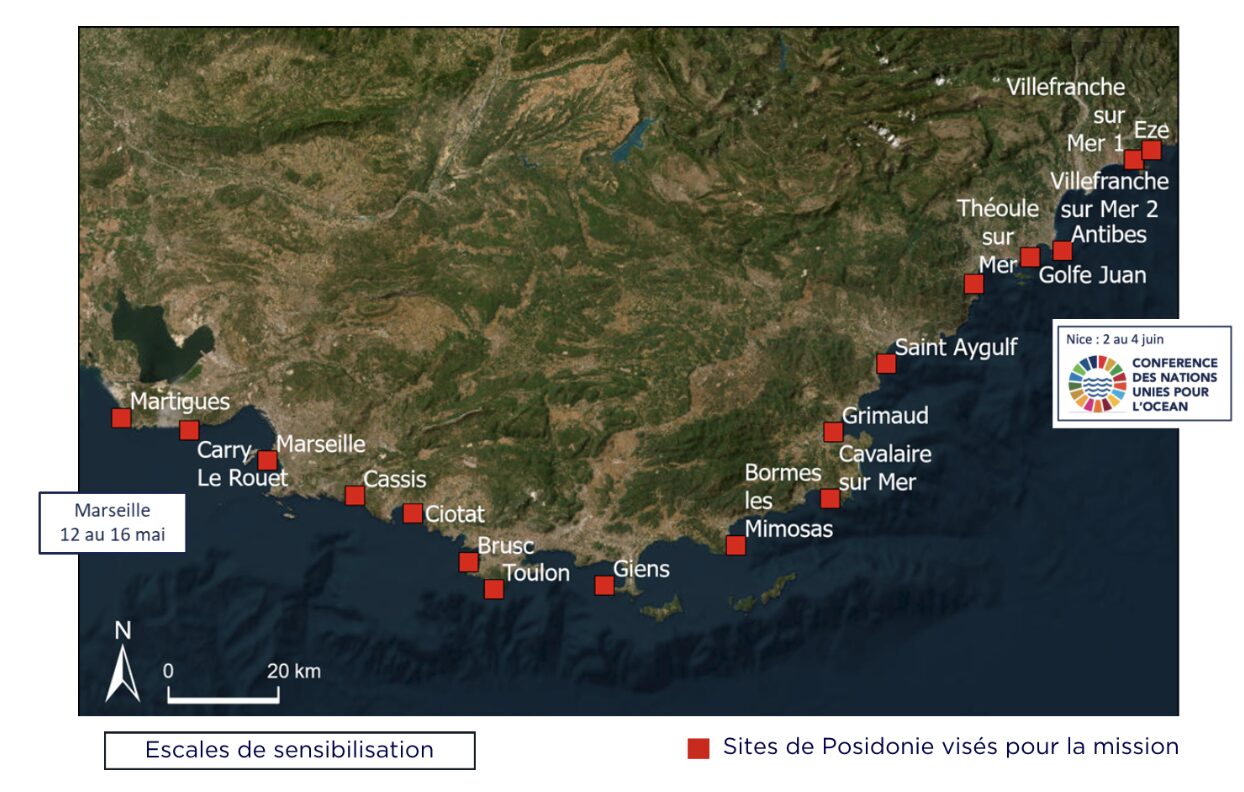 - Visit and assess characteristic seagrass meadows in the Southern Region: preserved areas (Port-Cros National Park), resilient areas (Prado Bay, heart of the Calanques National Park), areas impacted by anchoring and/or introduced species (Gulf of Saint-Tropez, Cannes Bay, Cap Martin).