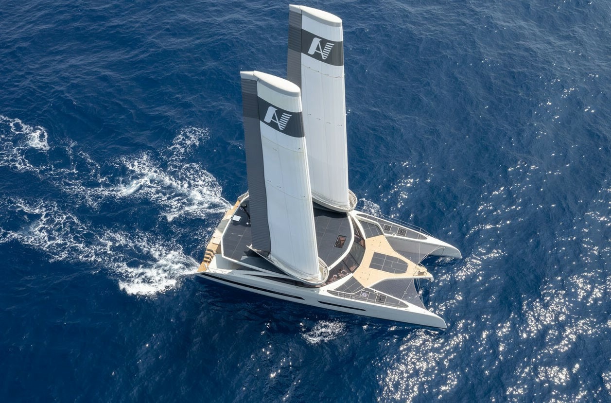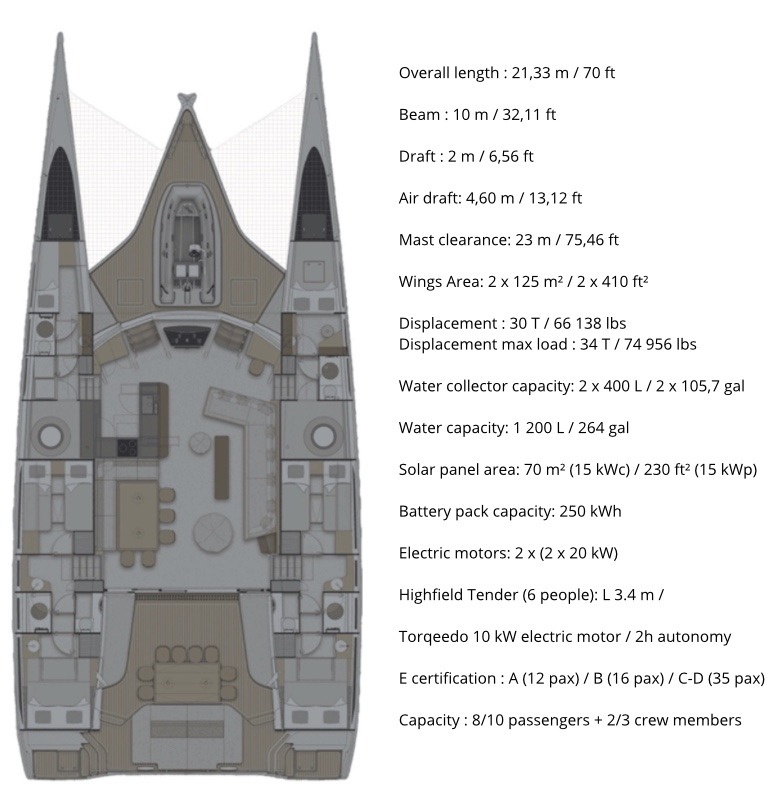 Thanks to its propulsion system, which combines solar energy, hydro-generation, and automated wing sails, it sails without producing CO₂ or noise pollution, thus protecting marine wildlife.