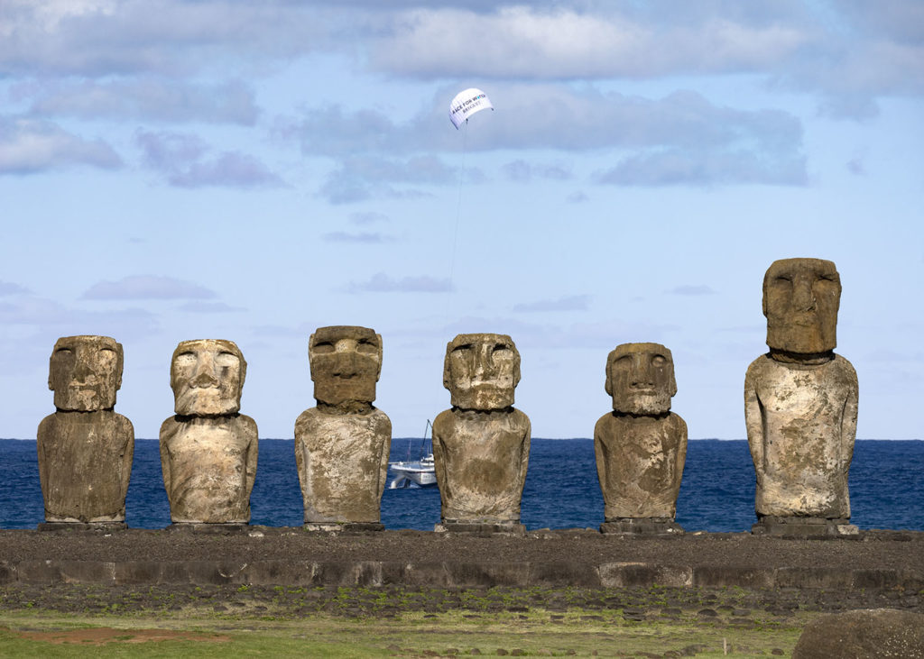 Franck David, directeur de l’odyssée : « Nous avons navigué entre Anakena sur la côte nord, et Hanga Roa en passant par le site mythique de Tongariki où sont exposés quinze Moaï uniques… Magnifique moment pour nous mais aussi pour celles et ceux qui nous accompagnaient. C’est important de pouvoir montrer in situ le fonctionnement de notre navire. Il est essentiel de démontrer qu’une navigation aux énergies propres est possible et que la transition énergétique est une réalité. »