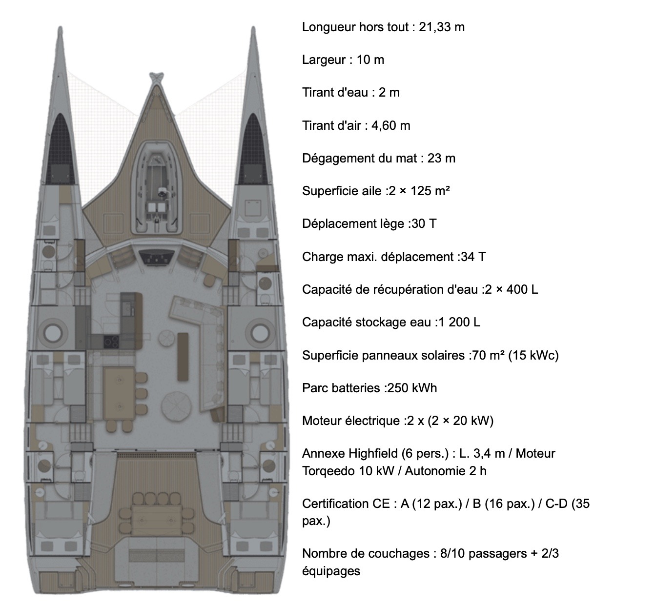 Grâce à sa propulsion combinant énergie solaire, hydrogénération et ailes véliques automatisées, il navigue sans produire de CO₂ ni de nuisance sonore, préservant ainsi la faune marine.