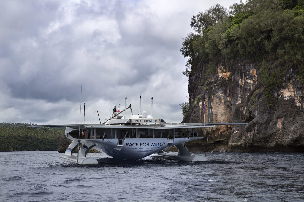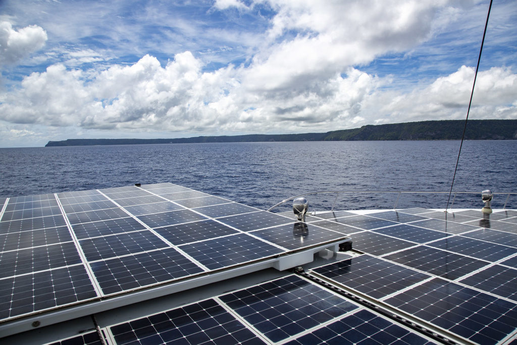 En effet, cette nuit, j’avais fait un rêve étrange… Il n’y avait plus d’océans, la mer s’était retirée suite à ce réchauffement climatique nié pendant des années et notre bateau s’était mué en vaisseau galactique qui se glissait entre des sommets immenses de plus de 10 000 mètres, empruntant des cols aériens, survolant des vallées invisibles dépourvues de tout habitant. Baleines, dauphins, requins, espadons, même les thons, tous les habitants des océans s’étaient évaporés dans l’atmosphère, seuls restaient quelques oiseaux de mer faméliques qui nous tournaient autour l’œil acéré dans l’espoir d’obtenir quelque maigre pitance. Heureusement, au réveil, la réalité est tout autre. Ce matin, à l’instar des enfants du Capitaine Grant, nous touchons à un archipel mystérieux aux falaises austères abritant sûrement des indigènes suspicieux…. A mesure de notre approche silencieuse, les détails de la côte se précisent, quelques rares plages de sable blanc enchâssées dans une végétation dense et verticale, au pied de falaises émeraudes élevées d’une bonne centaine de mètres. Nous avons beau scruter les alentours de toutes nos jumelles, aucune trace d’habitations, aucune fumée s’élevant dans l’azur trahissant quelque foyer. Au premier abord, cette île nous parait inhabitée.