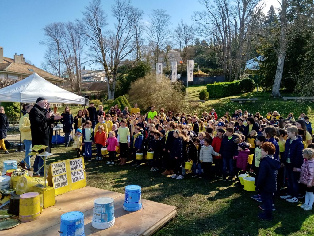 Tous les élèves de la 14ème à la 7ème ont rendu hommage au travail de l’artiste et aux océans en entonnant une chanson sur la planète, accompagnés par Bob Buckets, artiste de rue bien connu des genevois, avec sa batterie d’objets recyclés.