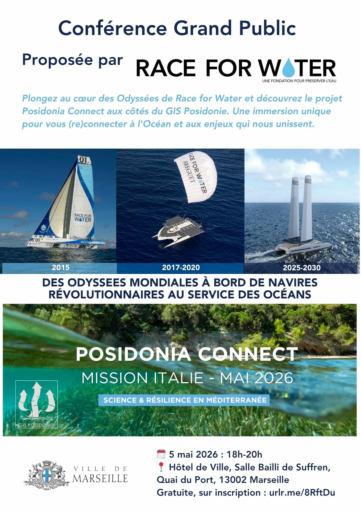 - 18h00 – 20h00 : Conférence publique « Odyssées Race for Water & Projet Posidonia Connect » à l'Hôtel de Ville de Marseille (Salle Bailli de Suffren)